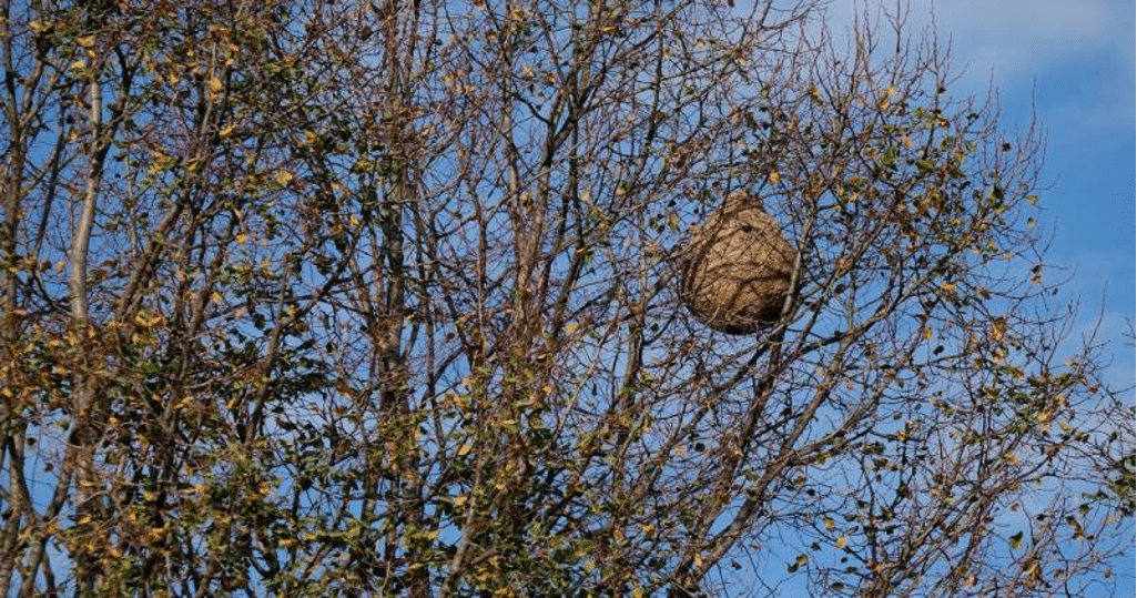 - Un nid d’été ou nid secondaire: dès le mois de juin, de forme sphérique, construit le plus souvent assez haut dans les arbres, de grande taille (diamètre de 40 à 80 cm) avec une petite ouverture latérale située à mi-hauteur.