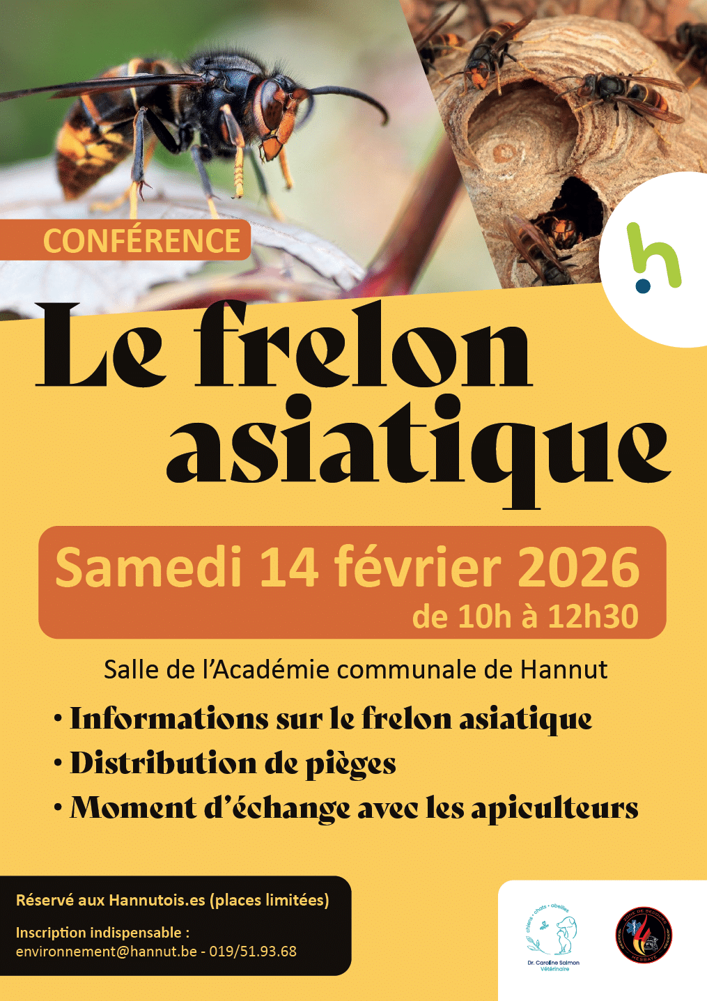 Conférence – Le frelon asiatique Date 14 Fév 2026 Heure 10:00 - 12:30 Lieu Académie de Hannut Rue des Combattants, 1 Catégorie Environnement Articles récents Opération « Sauvetage des batraciens » ! TRAVAUX RUE JEAN MOTTIN Collecte des sapins Ensemble pour des routes et des trottoirs sûrs et accessibles Taxe sur les déchets ménagers en 2026