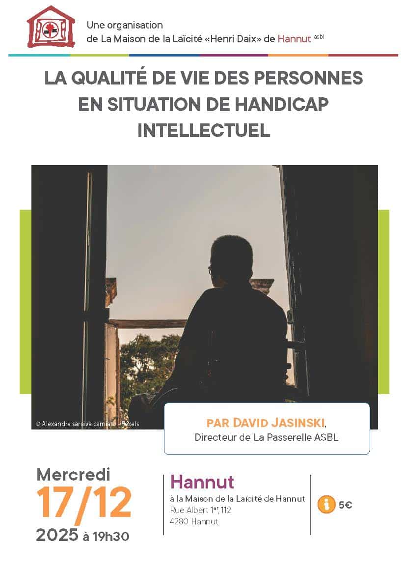 Au travers de la présentation de divers concepts, Monsieur David Jasinski va développer une idée de la qualité de vie des personnes en situation de handicap intellectuel. Il va aussi présenter le travail effectué au sein de La Passerelle asbl à Hannut