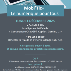 Mobi’Tic+ Date 21 Jan 2025 Expiré! Heure 09:30 - 12:00 Lieu Académie de Hannut Rue des Combattants, 1 Téléphone 019519063 Catégorie Enseignement PCS Seniors Organisateur PCS Téléphone 019/51.93.88 Email pcs@hannut.be Articles récents Station de pompage de Petit-Hallet RESA holding – Assemblée générale ENODIA – Assemblée générale RESA – Assemblée générale SPI – Assemblée générale