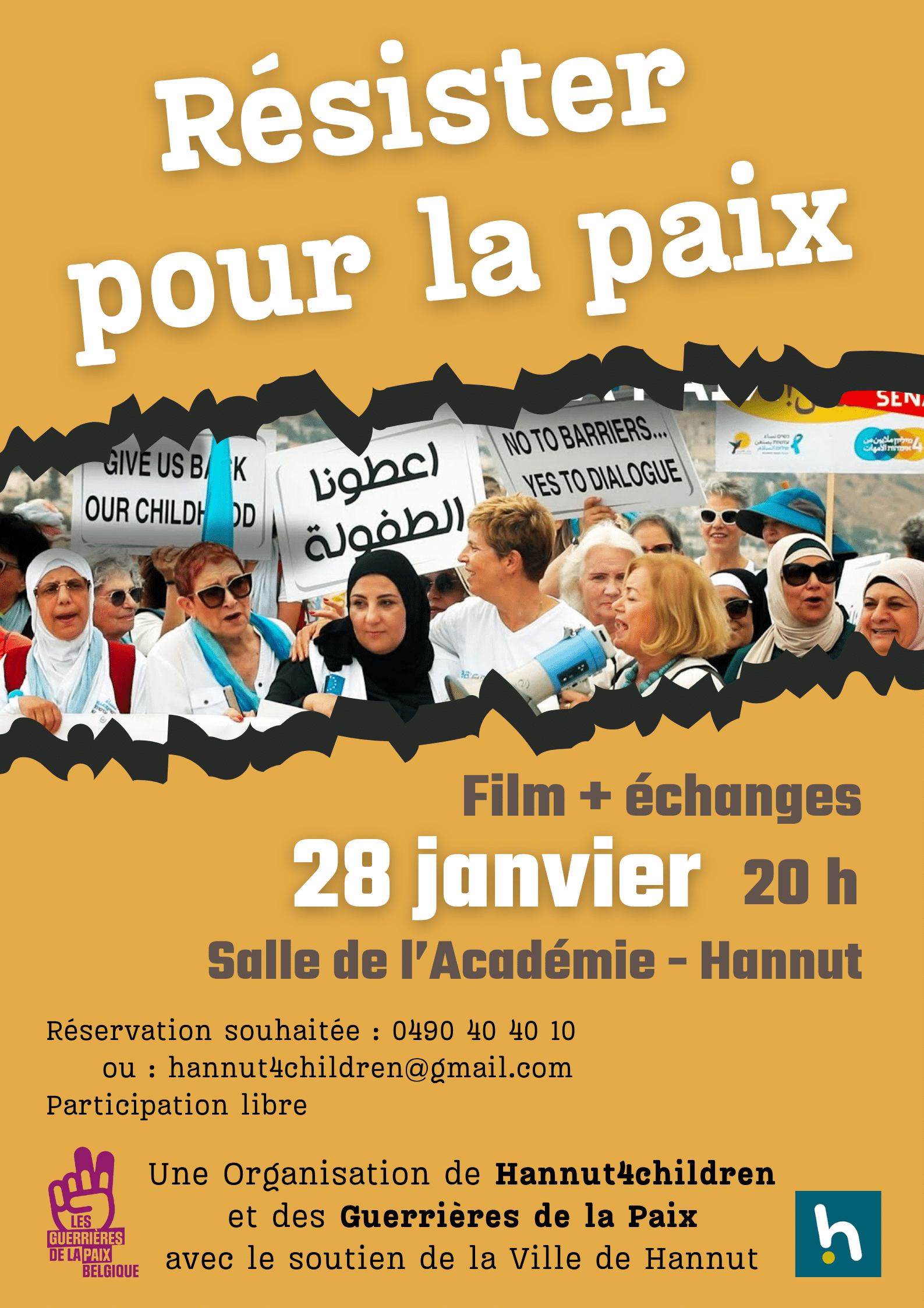 Après le dépôt d’une pétition au Conseil communal de Hannut, après la signature par celui-ci d’une déclaration d’intention, et après un soutien à l’action « Stop Bombing Civilians » de Handicap International, Hannut4Children, en collaboration avec l’association « Les guerrières pour la paix » et la Ville de Hannut, invite le public à découvrir le film « Résister pour la Paix », le mercredi 28 janvier à 20 heures, dans la salle de l’Académie de Hannut (1 rue des Combattants).