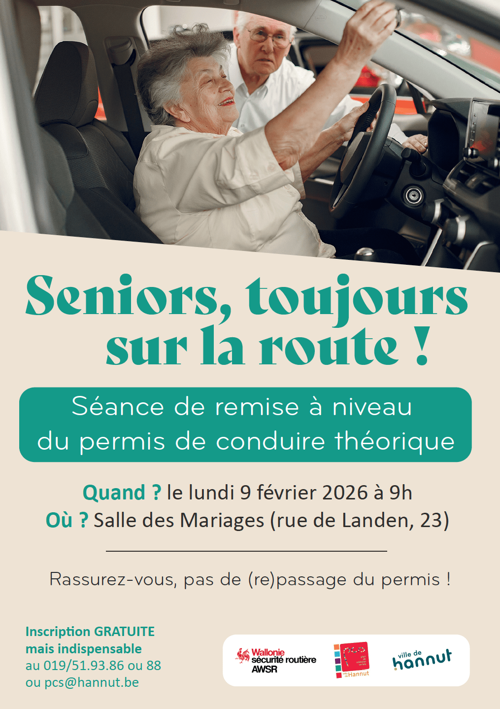 Seniors toujours sur la route ! Date 9 Fév 2026 Heure 09:00 - 12:00 Lieu Administration communale Rue de Landen 23 Catégorie PCS Seniors Organisateur PCS Téléphone 019/51.93.88 Email pcs@hannut.be Articles récents TRAVAUX RUE JEAN MOTTIN Collecte des sapins Ensemble pour des routes et des trottoirs sûrs et accessibles Taxe sur les déchets ménagers en 2026 OFFRE D’EMPLOI – COLLABORATEUR URBANISTIQUE (m/f/x)