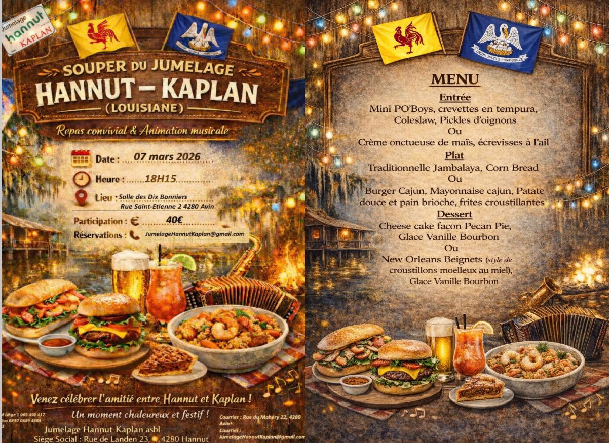 Le comité de Jumelage Hannut-Kaplan vous invite au souper qu’il organise le samedi 7 mars prochain.