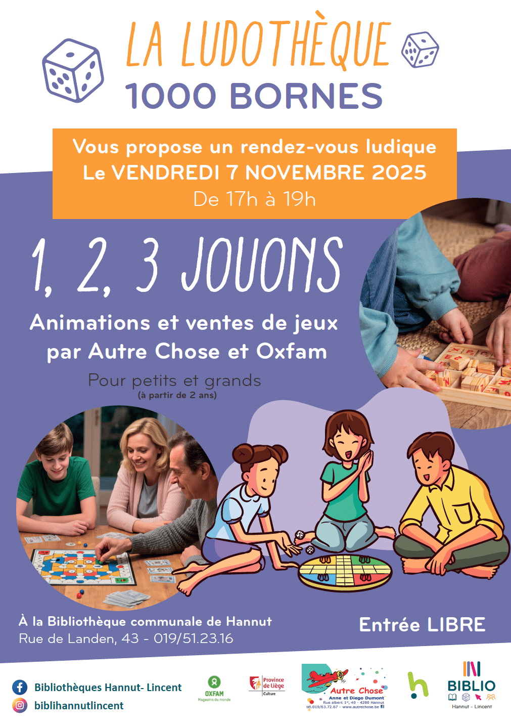 Tables de jeux « 1, 2, 3 Jouons » Date 7 Nov 2025 Heure 17:00 - 19:00 Lieu Bibliothèque communale de Hannut Rue de Landen, 43 4280 HANNUT Téléphone 019/51.23.16 Organisateur Bibliothèque communale de Hannut Téléphone 019/51.23.16 Email bibliotheque@hannut.be Articles récents Jour férié – 1 novembre bureaux fermés Imio – ASSEMBLEE GENRALE AIDE – ASSEMBLEE GENERALE Enquête publique Elia – Liaison Tihange-Avernas Phishing – Sensibilisation