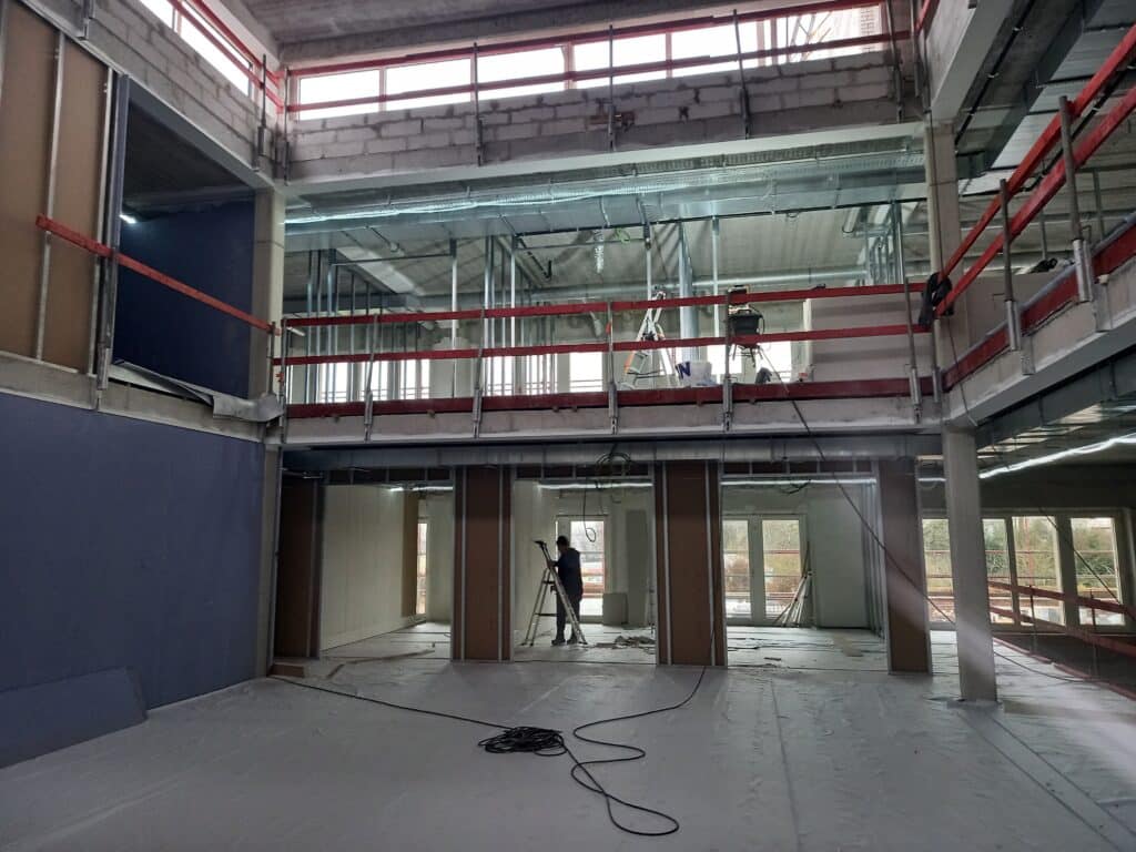 Depuis le début 2026, le chantier continue d’évoluer à l’intérieur, avec les avancées sur les cloisons des différents bureaux et espaces de travail, ainsi qu’à l’extérieur avec le placement des dernières baies vitrées.