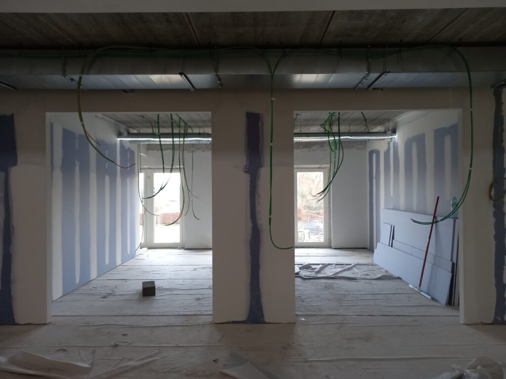 Après les châssis, les vitrages ont récemment été posés sur l’ensemble du bâtiment. À l’intérieur du bâtiment, les travaux du chauffage sol ont commencé, ainsi que ceux de plafonnage.
