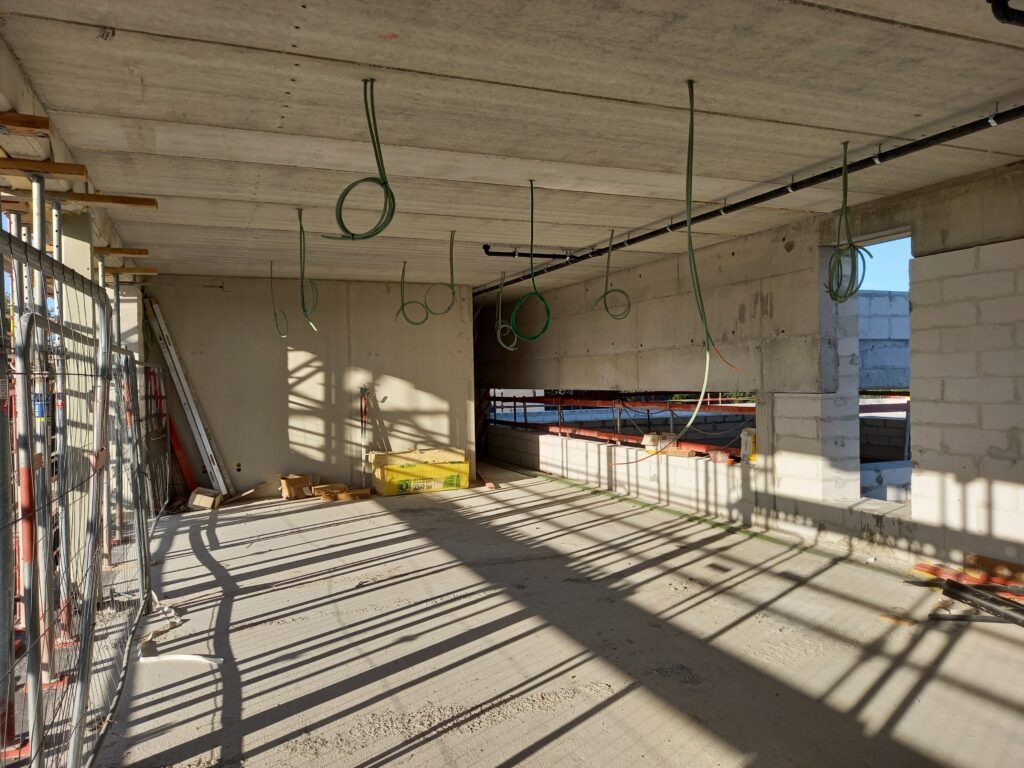 Au programme de la semaine passée : la pose des prémurs et des poutres en acier. Un prémur est un élément constructif préfabriqué composé de deux parois en béton armé reliées entre elles par des treillis métalliques. Il est livré et posé sur le chantier à l’aide d’une grue. Ensuite, l’espace vide entre ces deux parois est rempli de béton.