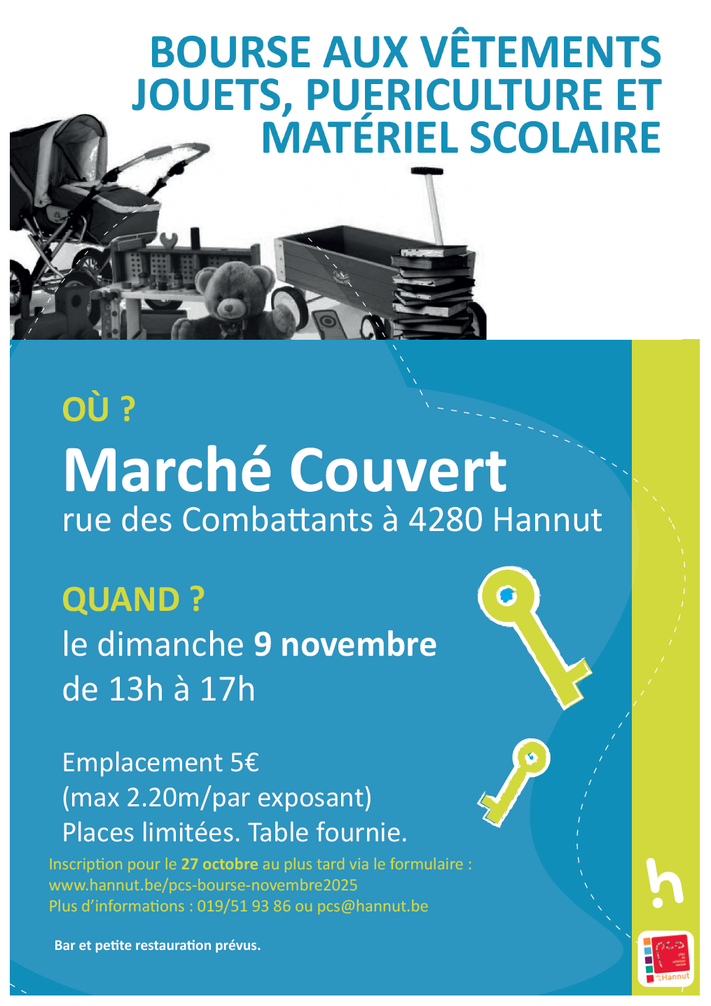 La ville de Hannut organise la traditionnelle bourse aux vêtements, jouets et puéricultures dans le cadre du Plan de Cohésion Sociale le dimanche 9 novembre de 13h à 17h, au marché couvert.